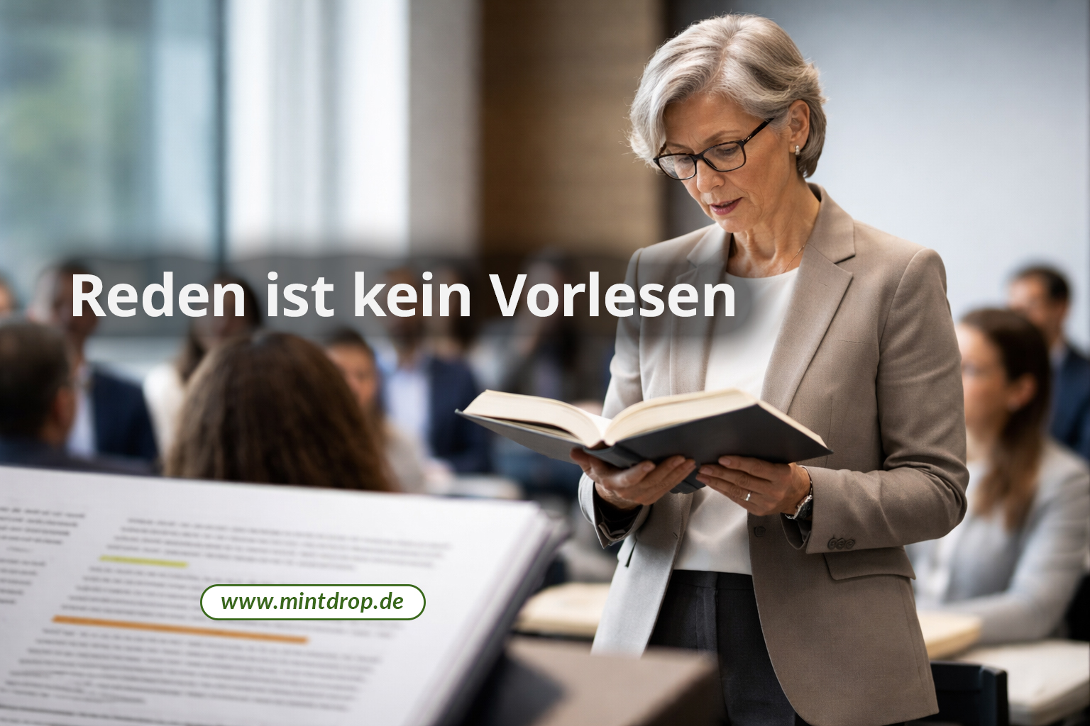 Vorlesen erzeugt Distanz. Freies Sprechen erzeugt Kontakt. Vorlesen fixiert den Blick auf das Manuskript. Freies Sprechen öffnet den Blick für Menschen. Vorlesen hält an Formulierungen fest. Freies Sprechen hält am Gedanken fest. Das ist ein fundamentaler Unterschied.